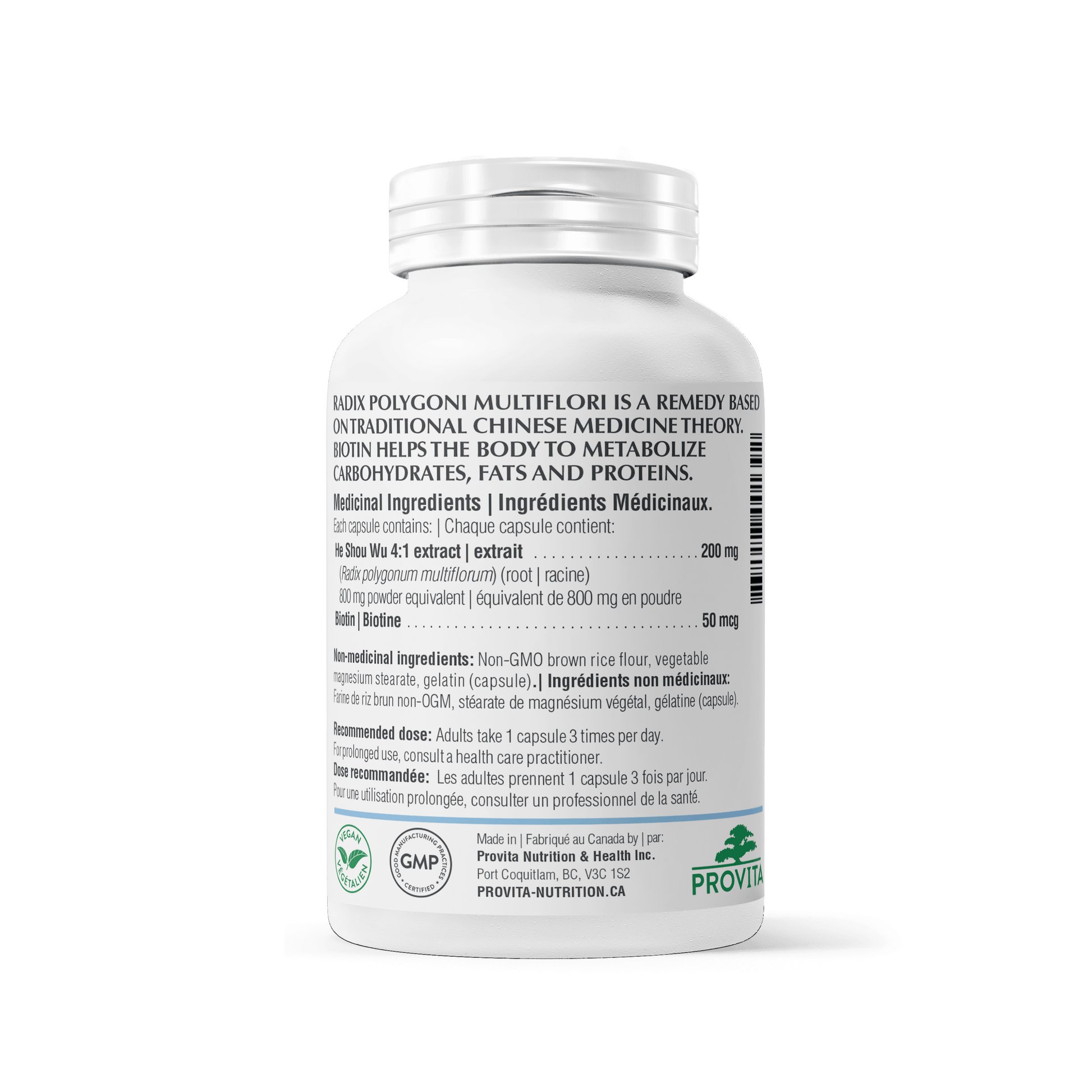 | Non Medicinal IngredientsNon-GMO brown rice flour, vegetable magnesium stearate. Capsule shell: bovine gelatin (kosher/halal). | Does not containGMO ingredients, dairy, egg, gluten, soy, wheat, corn, yeast, nuts, artificial sweeteners, preservatives, colors or flavors. |